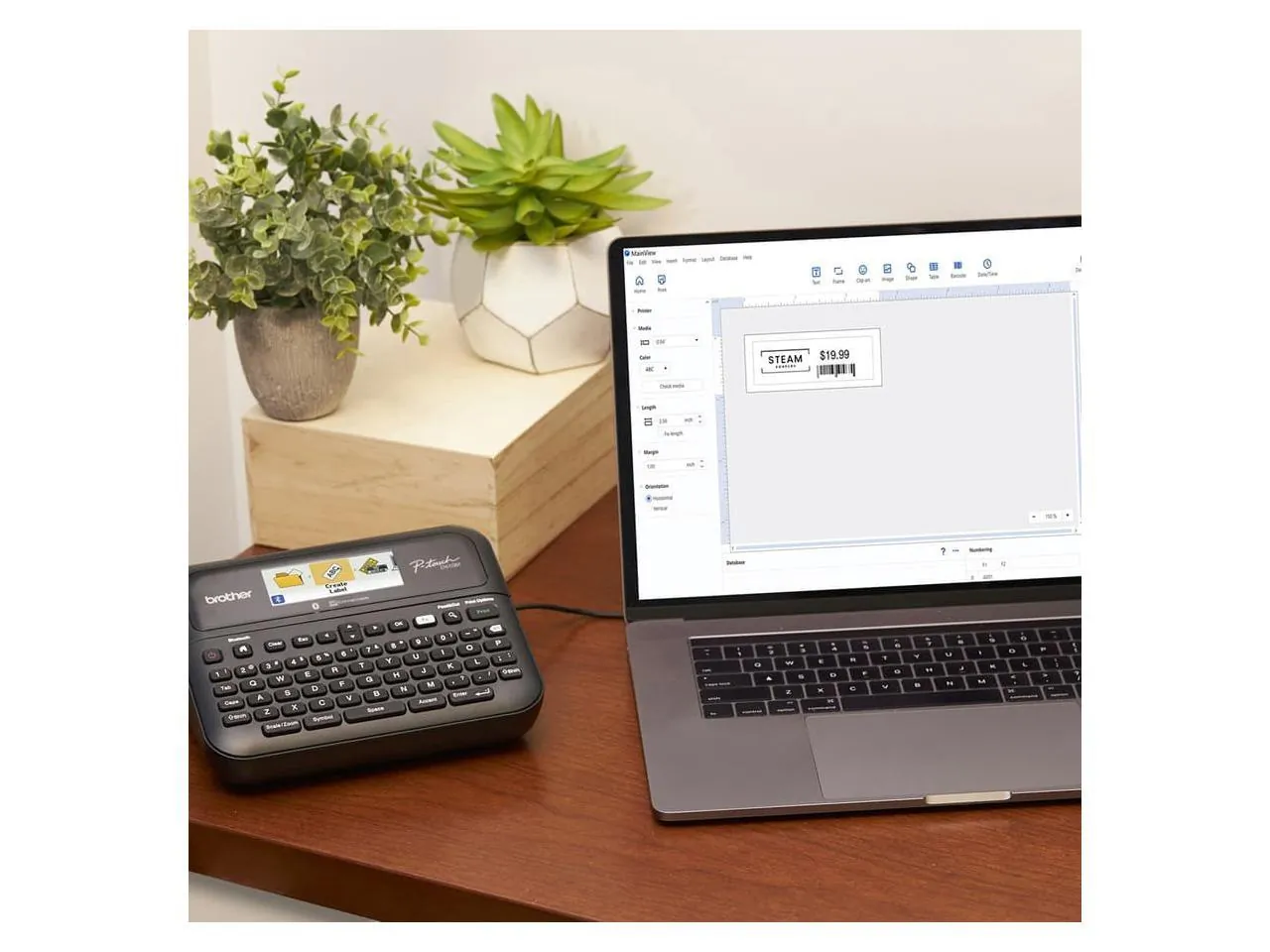 Business Professional Connected Label Maker Value Pack features high-resolution printing for sharper bar codes and more with full-color LCD screen. Create labels using your computer or mobile phone via Bluetooth with P-touch Editor Software1 and Brother iPrint app. Advanced connectivity allows multiple users with their own device to work with the same labelmaker. Increase efficiency on high-volume labeling jobs with faster printing and built-in, automatic label cutter. Maximum printing speed is 30mm per second. Enjoy sharp 180 x 360 dpi resolution. Easily type using the QWERTY keyboard, one-touch formatting keys and large 20-character, two-line screen preview. Choose between 17 fonts, 17 font styles, 160 frames, 900 symbols and 175 pre-set label templates. High memory capacity saves up to 90 used labels. It prints up to 99 copies. Labelmaker uses 1" tape and is compatible with Brother Genuine TZe Label Tapes for indoor and outdoor use. Transport label printer using included case.