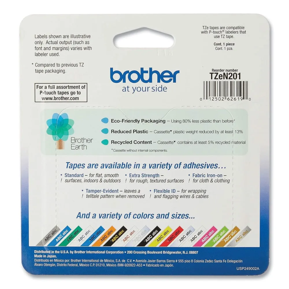 Marketing Information:This Genuine TZe-N201 Narrow Non-Laminated Tape with eco-friendly packaging fits into super-narrow spaces many labels can't cover. It is the ideal size for CD jewel cases, file folders, jar lids, book plates, small containers and other slim applications. Designed for indoor use, this simple, non-laminated tape sticks on flat dry surfaces with Brother's standard strength adhesive. It is easy to use and apply with the perforated, easy-peel backing. Print is black. Background is white. Sustainable packaging is made with responsibly sourced FSC-certified paper.