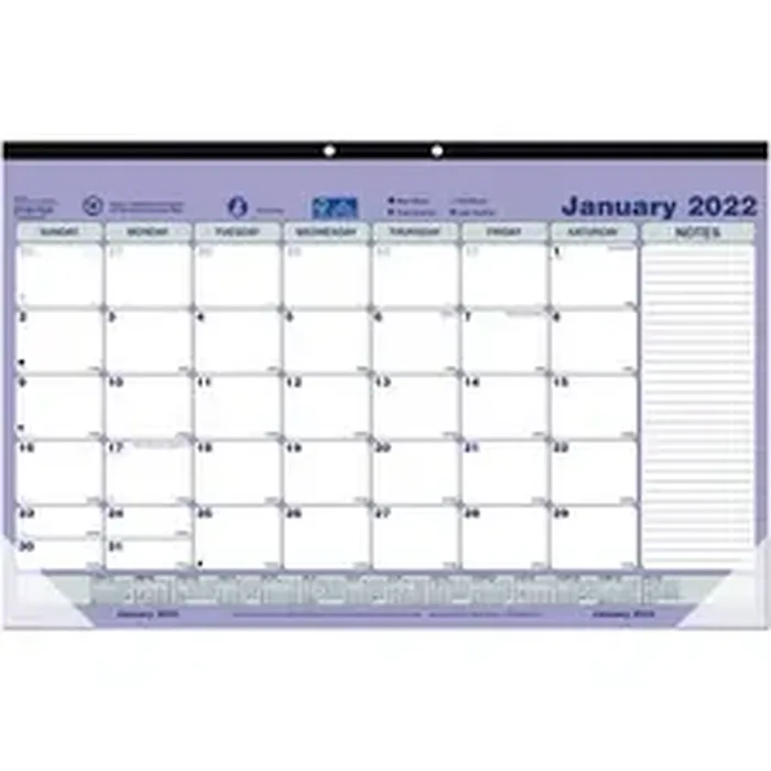 Desk/wall calendar offers easy-to-read, monthly references and protection for your desk surface. Dated planning pages range 12 months from January to December. One-page-per-month format includes unruled daily blocks, Sunday-through-Saturday scheduling, ruled notes column on the right edge, count of days/days remaining, moon phases, holidays and 14-month calendar reference at the bottom of the sheet. Top-bound, perforated sheets easily tear off headband. Nonrefillable calendar pad also features reinforced chipboard backer, vinyl corners and two eyelets in the headband for hanging. Planning pages are printed in English.