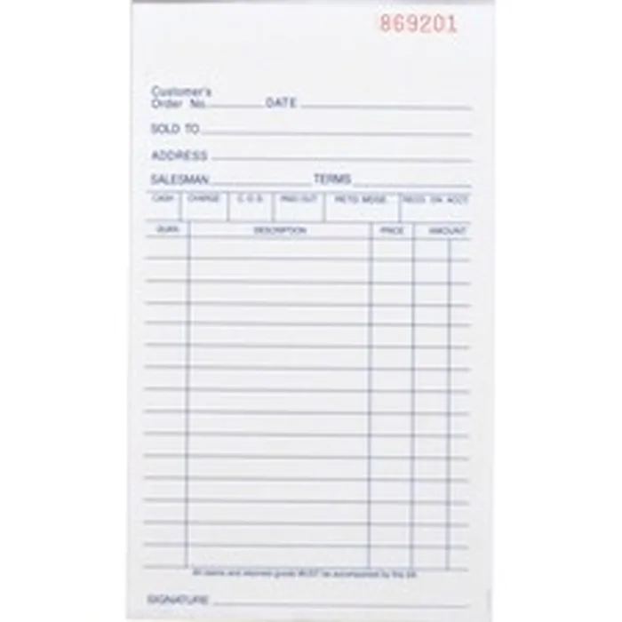 All-purpose book of carbonless forms can be used for orders, sales, purchase orders, credit memos or receiving forms. Versatile, two-part forms include prompts for date, "sold to," buyer's address, salesperson's name, terms, seller's signature, item description with quantity, price and amount. A line of boxes above the item description allows you to check or fill out "Cash," "Charge," "C.O.D.," "Paid Out," returned merchandise and received on account. Forms are consecutively numbered in red ink and perforated at the top for easy tear-out. Paper sequence is originals in white and duplicates in canary.