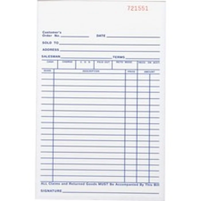 All-purpose book of carbonless forms can be used for orders, sales, purchase orders, credit memos or receiving forms. Versatile, two-part forms include prompts for date, "sold to," buyer's address, salesperson's name, terms, seller's signature, item description with quantity, price and amount. A line of boxes above the item description allows you to check or fill out "Cash," "Charge," "C.O.D.," "Paid Out," returned merchandise and received on account. Forms are consecutively numbered in red ink and perforated at the top for easy tear-out. Paper sequence is originals in white and duplicates in canary.