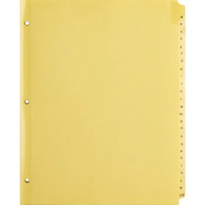 Indexes feature clear-coated tabs are durable and clearly visible on both sides. Plastic tabs extend 3/8". Heavy-duty paper is reinforced at binding edge. Dividers feature three 9/32" punched holes and buff-colored paper. Lettered tabs range from A to Z.