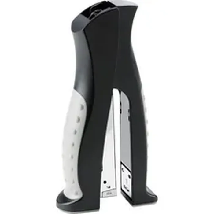 Stapler offers ergonomic stand-up design that takes up less desk space than conventional desktop staplers. Rotating anvil allows stapling and pinning. Design also features comfort hand grips and all-metal working parts. Stapler fastens up to 20 sheets of 20 lb. paper using standard staples. Staple capacity is 210 staples.