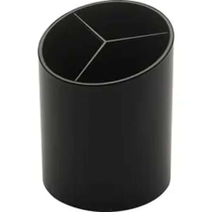 Large pencil cup features three individual compartments for writing utensils, scissors and other tall office essentials. Sloped front offers easy access to each item. Pencil cup is made of plastic.