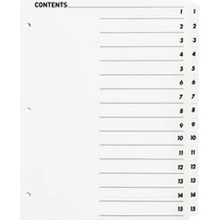 Business BSN 05857 Table Of Content Quick Index Dividers Printed Tabs Digit 115 15 Tabsset 8.5 Divider Width X 11 Divider Length 3 Hole Punched White Divider White Mylar Tabs 15 Set