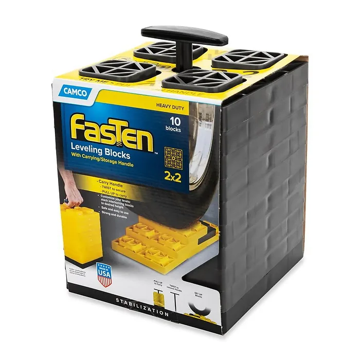The Camco FasTen Leveling Blocks allow you to stack the interlocking blocks to the desired height for safe and easy leveling. Each block adds a full inch to stack height. Camco’s FasTen Leveling Blocks can be used with single wheels, double wheels, hydraulic jacks, tongue jacks, stabilizer jacks, 5th wheel jacks, and tandem axles. The convenient carrying handles easily pull up for carrying or twist down to secure blocks together for storage. Product dimensions: 8.5” x 8.5” x 1”. Stack height should not exceed 4-1/2 inches.