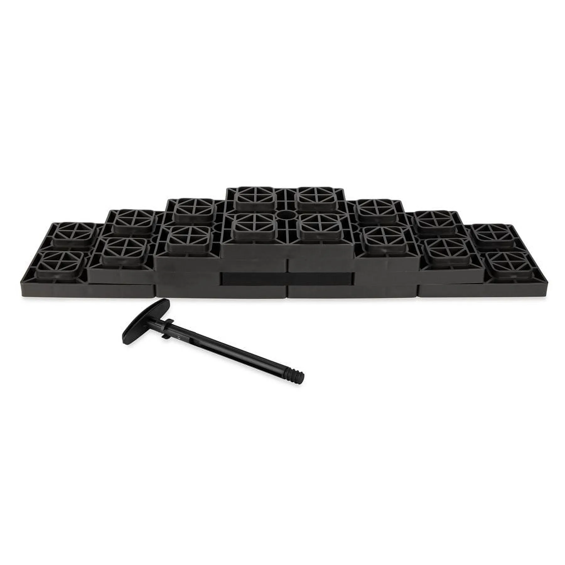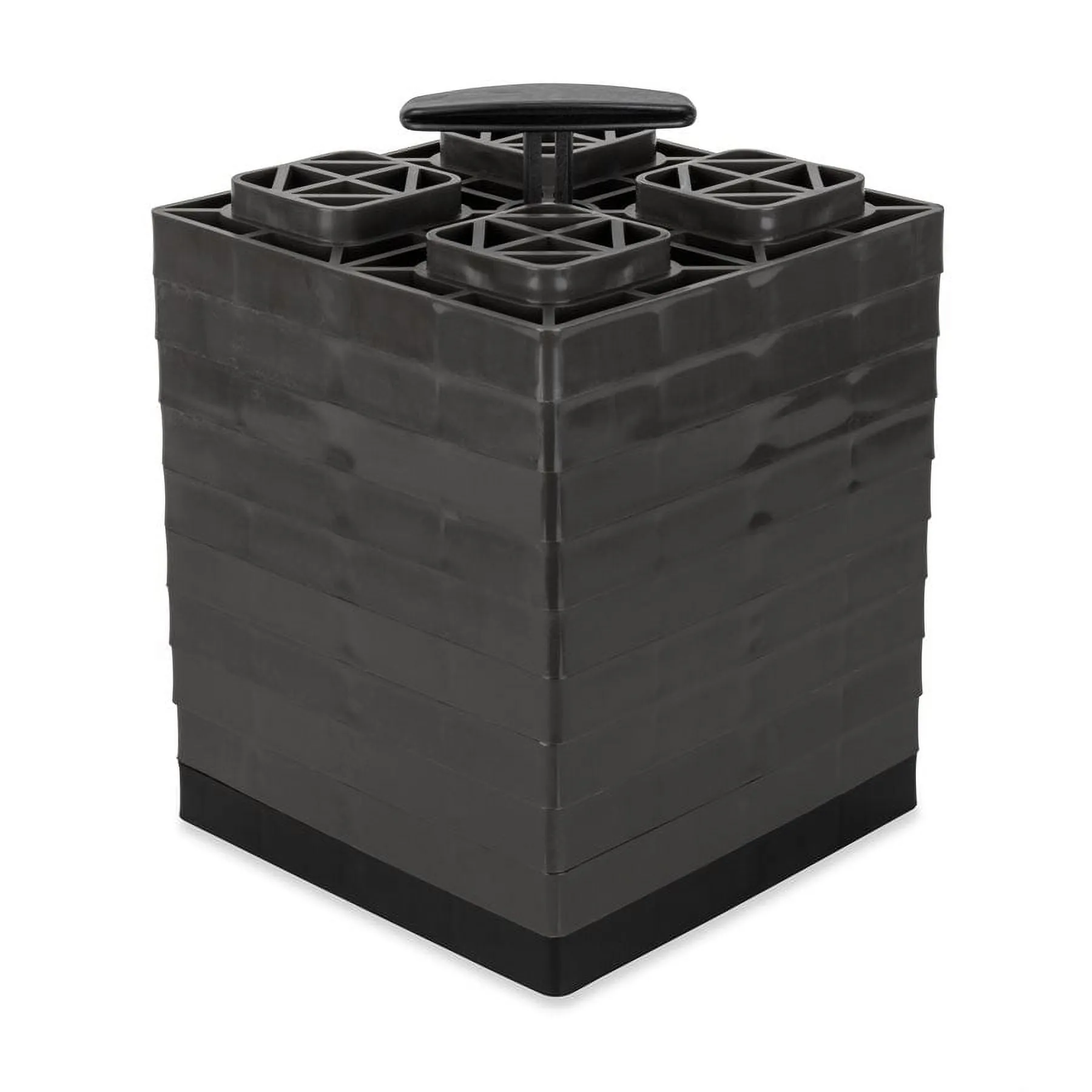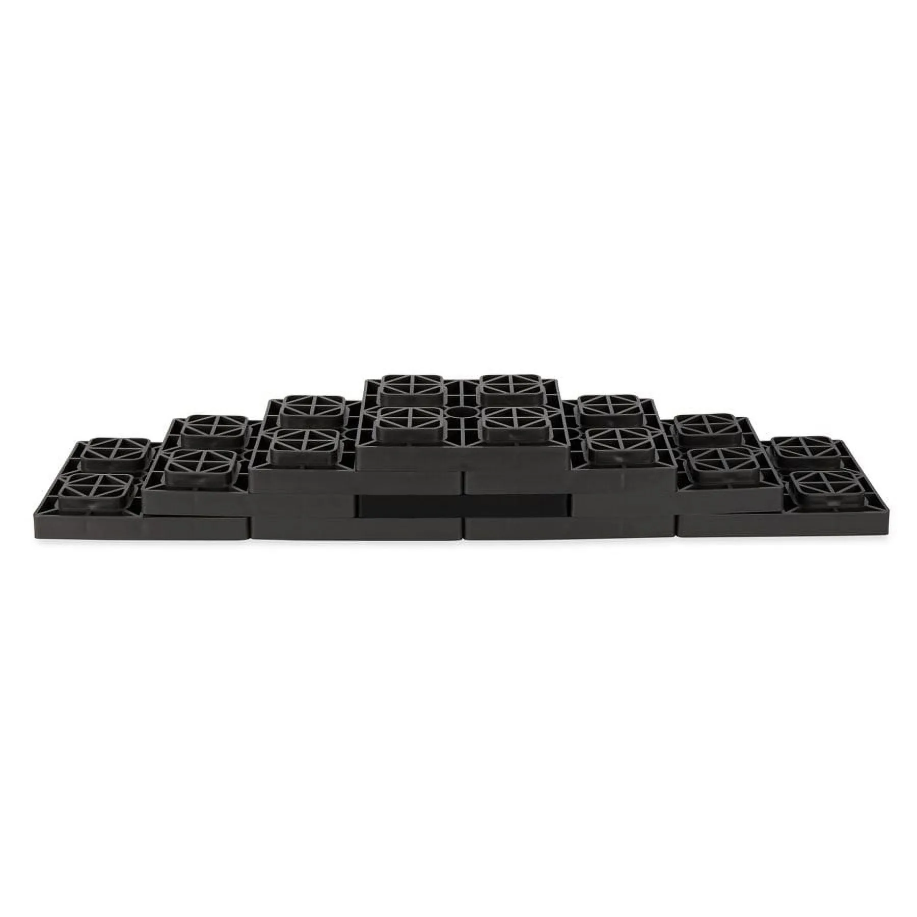 - 10 interlocking blocks stack to the desired height for customizable leveling