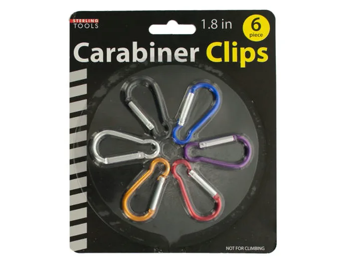 Great for holding keys, camping gear and more, this 6-piece Carabiner Clips Set features strong metal clips in a variety of colors. Clips measure approximately 1.8" long. Not for climbing. Comes packaged in a blister pack.