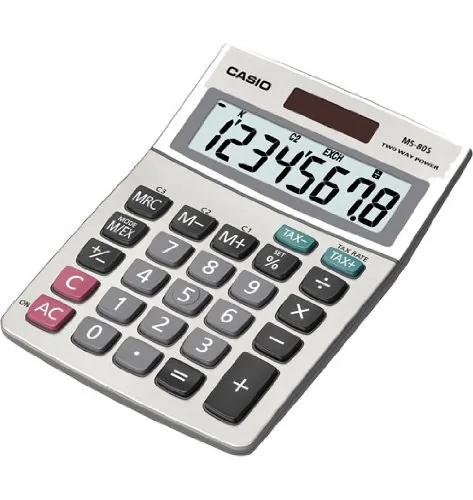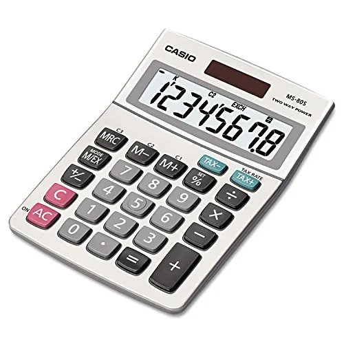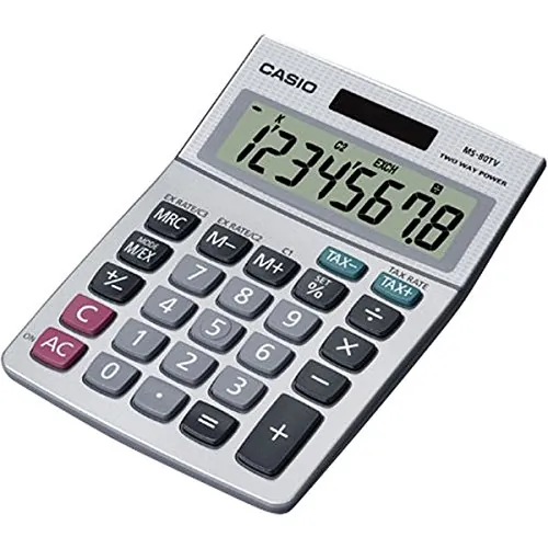 1 Line(s) - 8 Digits - LCD - Battery/Solar Powered - 1.3" x 4" x 5.4" - Silver - 1 Each General Information Manufacturer: Casio Computer Co., Ltd Manufacturer Part Number: MS80S Brand Name: Casio Product Model: MS-80S Product Name: MS-80S Desktop Calculator Marketing Information: Desktop tax calculator features eight digits (16-digit approximations), large easy-to-read display, and tax and currency exchange function. Other functions include constants for addition, subtraction, multiplication, division; independent memory, markup percent and three-digit comma markers. Calculator runs on solar power with mercury-free battery backup. Packaged Quantity: 1 Each Product Type: Simple Calculator Technical Information Operations/Functionality: Profit Margin %Change Sign (+/-)Constants for MDASTax & Currency ExchangePercentageKey Rollover Display & Graphics Number of Display Lines: 1 Number of Display Digits: 8 Display Screen Type: LCD Battery Information Power Source: Battery/Solar Physical Characteristics Product Color: Silver Height: 1.3" Width: 4" Length: 5.4" Weight (Approximate): 4 oz Miscellaneous Recycled: No Post-consumer-waste%: 0% Assembly Required: No Country of Origin: China
