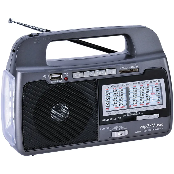 Supersonic SC-1082 9-Band AM/FM/SW1-7 Portable Radio. Portable AM/FM/SW1-7 receiver , MP3 playback, High-sensitivity receiver, USB input, SD(TM) Card reader, Built-in flashlight, Powerful speaker, Built-in rechargeable battery, 360? antenna, AC power supply, Requires 3 D batteries for DC power;