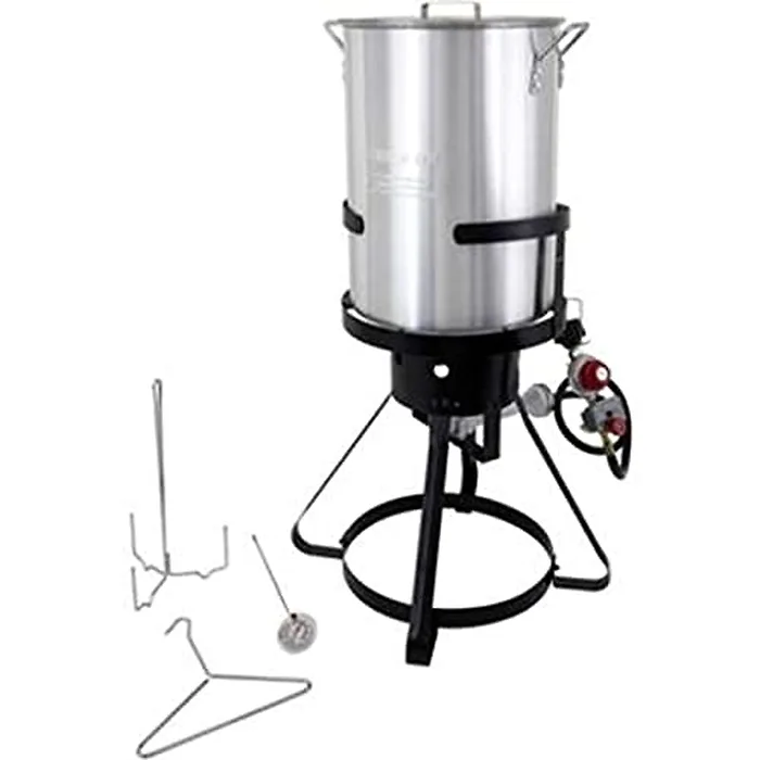 The Chard 30-Quart Aluminum Turkey Fryer Kit is large enough to cook an 18-lb. bird. The kit includes a heavy-duty 30-qt. aluminum with side handles & cover, a 21-inch steel 4-legged stand, a 38,000 BTU cast iron burner, an adjustable regulator with safety timer & hose, and a 12" deep-fry thermometer. CSA Design Certified.