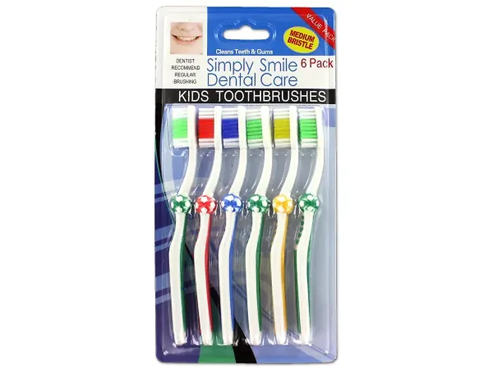 Great for getting kids excited about brushing, this 6-piece set of medium bristle Children's Soccer Toothbrushes is made with a rubberized grip for comfort and a fun soccer ball design. The bent neck helps clean hard to reach back teeth. Each toothbrush measures approximately 6" long. Comes packaged in a blister pack.