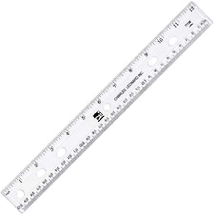 12" plastic ruler features a double-beveled edge for accurate readings on both sides. Raised calibrations are clearly defined to allow quick measurements while preventing reading errors. Holes in the center allow immediate storage in ring binders (sold separately) to ensure you always have this tool within easy reach. Transparent plastic material allows printed materials to show through so you know exactly where you're measuring.