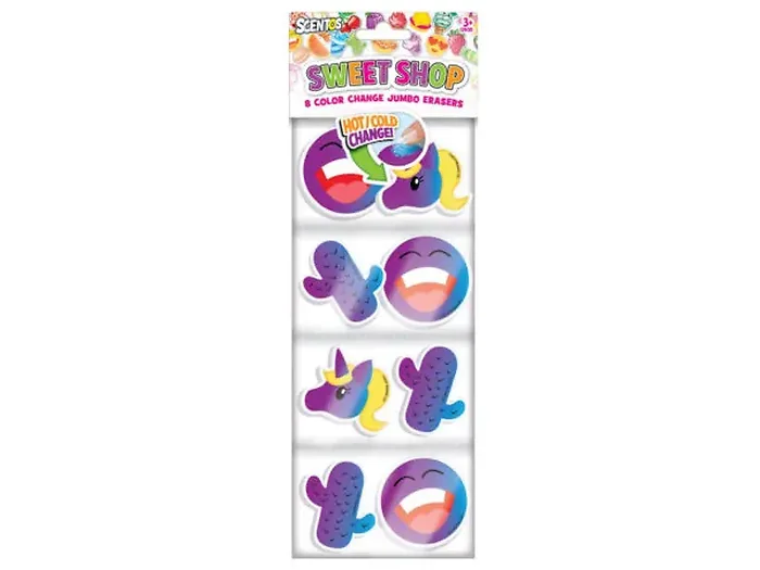 Make correcting mistakes enjoyable with this vibrant 8-piece Color Change Jumbo Erasers Set featuring delightful designs like emoticon smiley faces, cacti, and unicorns. These fun erasers uniquely change colors based on temperature—areas in pink and orange become lighter when warm and darker when cold. Perfect for kids aged 3 and up, this set is packaged in a poly bag with a header card for easy display.
