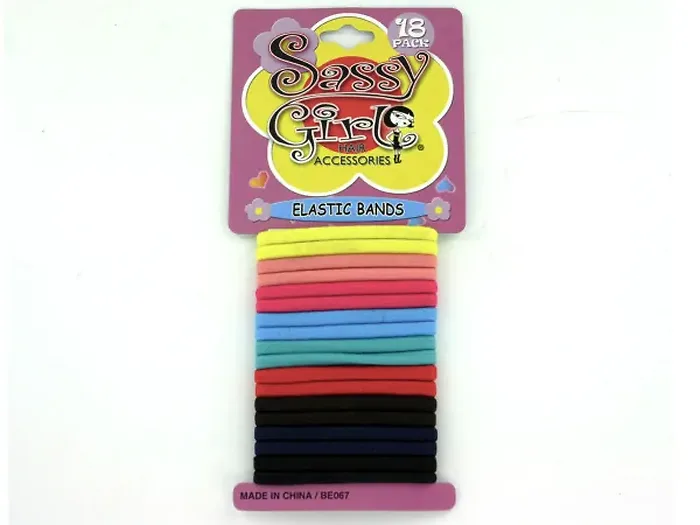 Great for casual looks and styles, this 18-piece Colored Elastic Hair Bands Set features firm elastic bands to hold ponytails and pigtails securely in place. There are 18 bands total (two of each color) ranging from light pastels to bright colors. Comes packaged on a hanging panel in a poly bag.