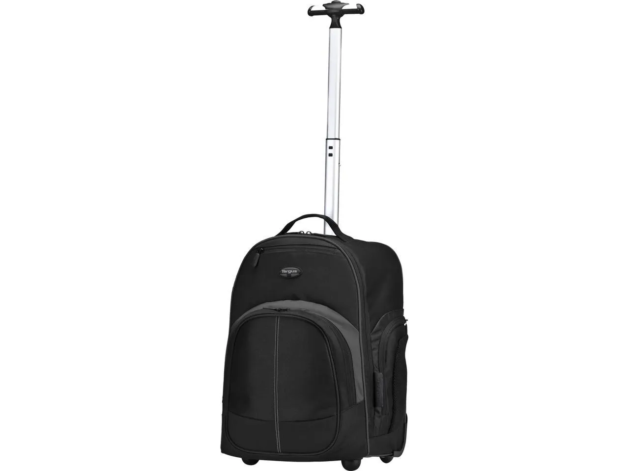 The Targus 16 Compact Rolling Backpack in sleek black goes anywhere you go. Use it as a carry on or a bag for getting around campus this backpack is functional in every way. Fully equipped with quiet roller wheels and a retractable handle, youll be rolling your materials easily and comfortably