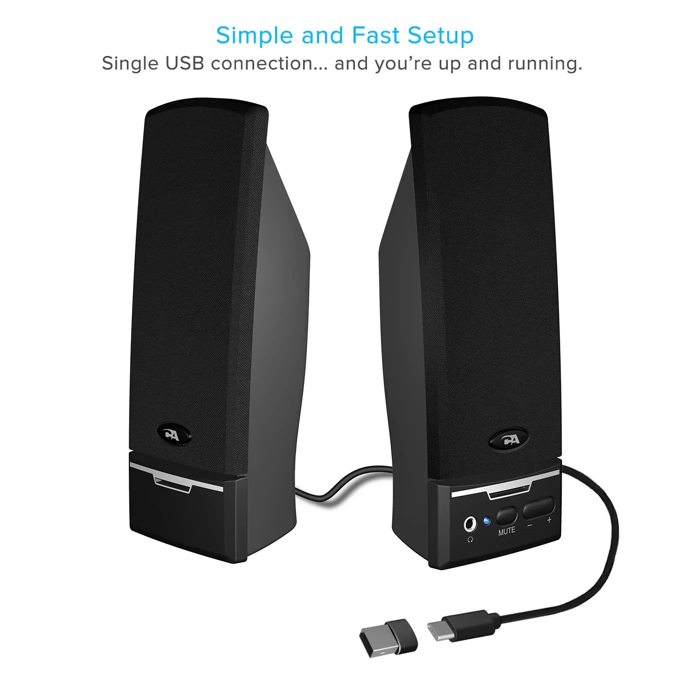 The Compact USB 2.0 Speaker System offers an immersive audio experience with its USB powered design. Easily connect via USB Type-C or Type A with the included adapter. Enjoy convenient satellite controls for volume adjustments and a quick speaker mute button, complete with an LED power indicator for easy visibility.