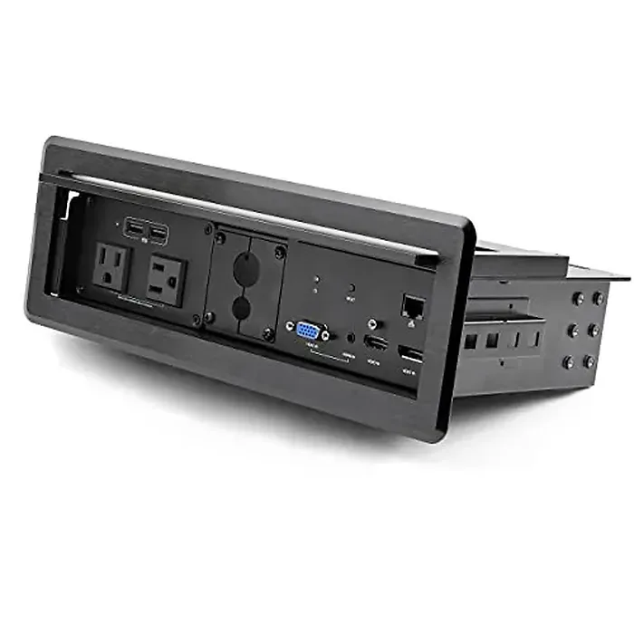 The AV & Power Connectivity Hub is designed to integrate seamlessly into conference tables, providing essential audio-visual and power connections. It features a sleek design that maintains the aesthetic of your workspace while offering easy access to power outlets and AV capabilities.