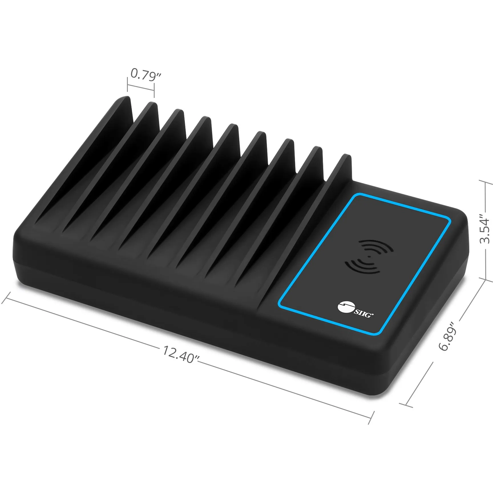 8 individual open slots wide enough to hold most tablets or smartphones make this an ideal space-saving charging solution