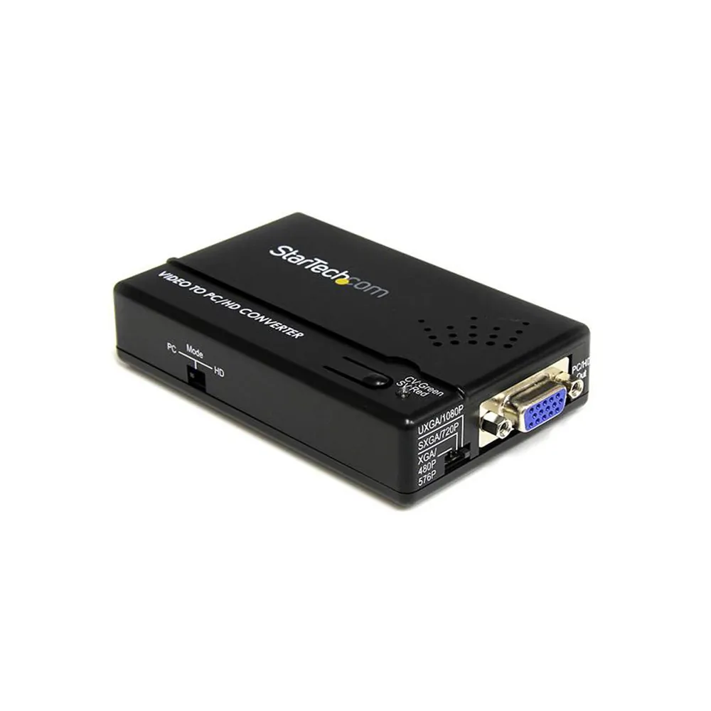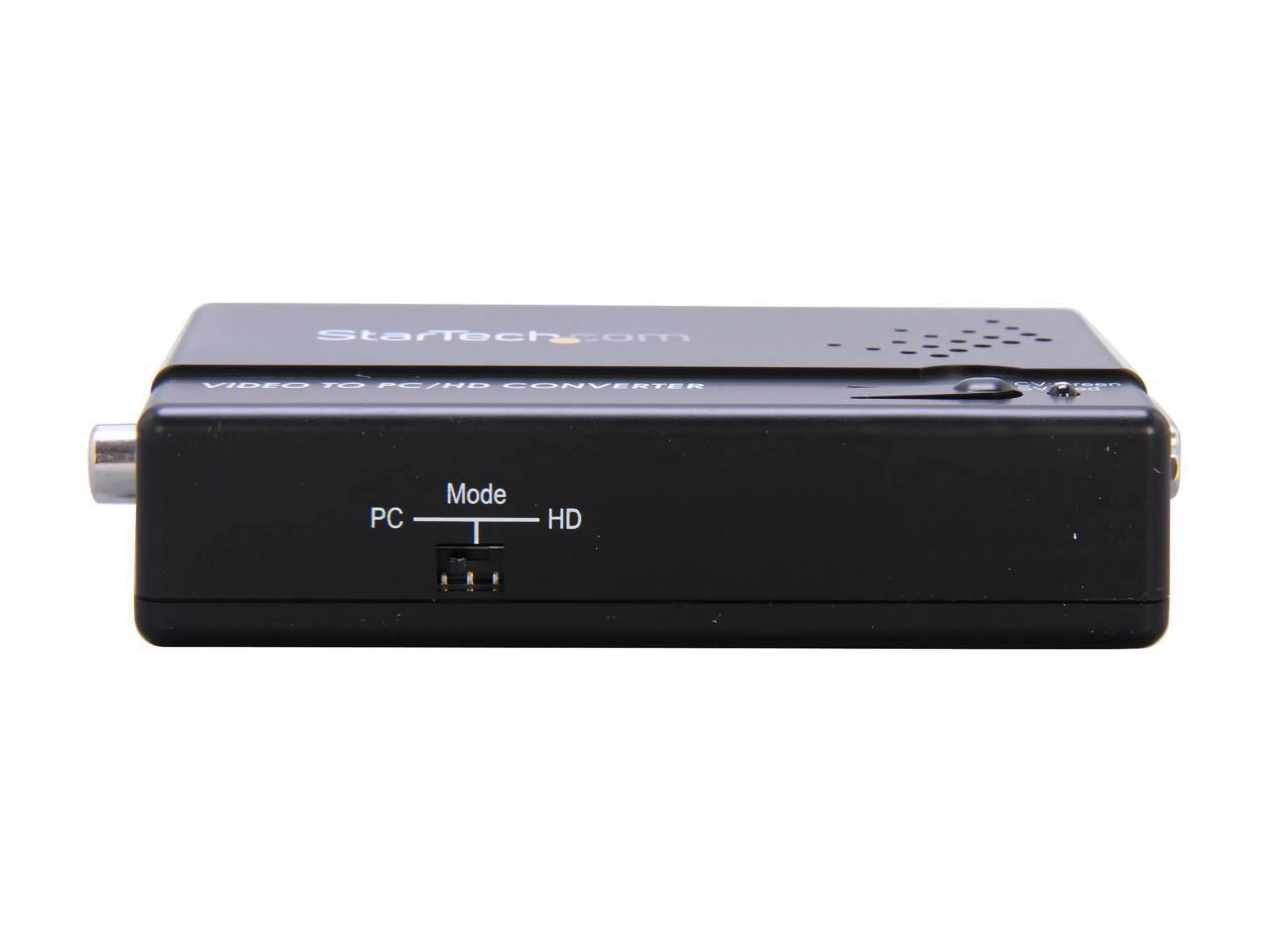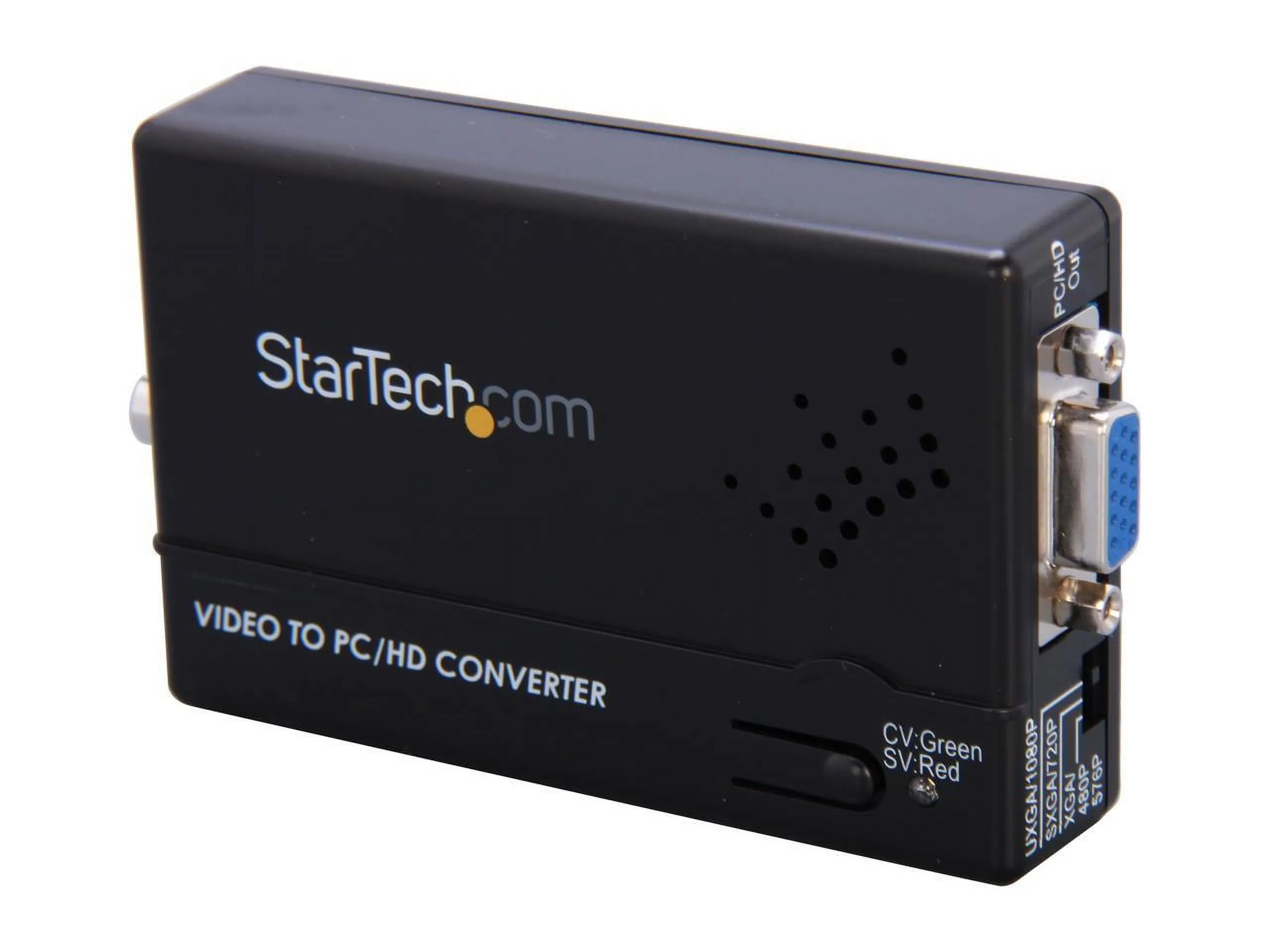 The VID2VGATV2 Composite and S-Video to VGA Video Scan Converter (with Scaler) provides a simple way to convert Composite or S-Video signals to VGA (or Component RCA) output, for use with computer monitors, projectors or HDTV sets. Equipped with an On-Screen Display (OSD) menu and dip switches for simple configuration and selection of your video output settings, this compact video scaler installs quickly and easily for a true plug-and-play experience. An integrated scaler circuit dynamically converts the S-Video or Composite video input signal, giving you multiple output resolutions to choose from, to ensure compatibility with your display or projector. Plus, the Component/S-Video-VGA Converter includes a VGA to Component (RCA) breakout cable, which enables you to connect to TV sets that are not equipped with a VGA port. Backed by a StarTech.com 2-year warranty and free lifetime technical support.