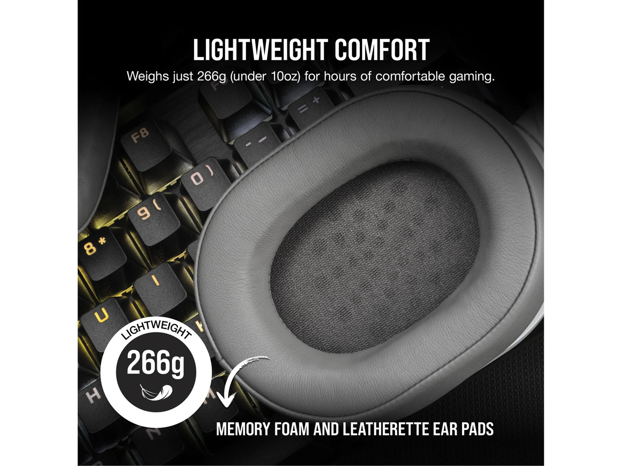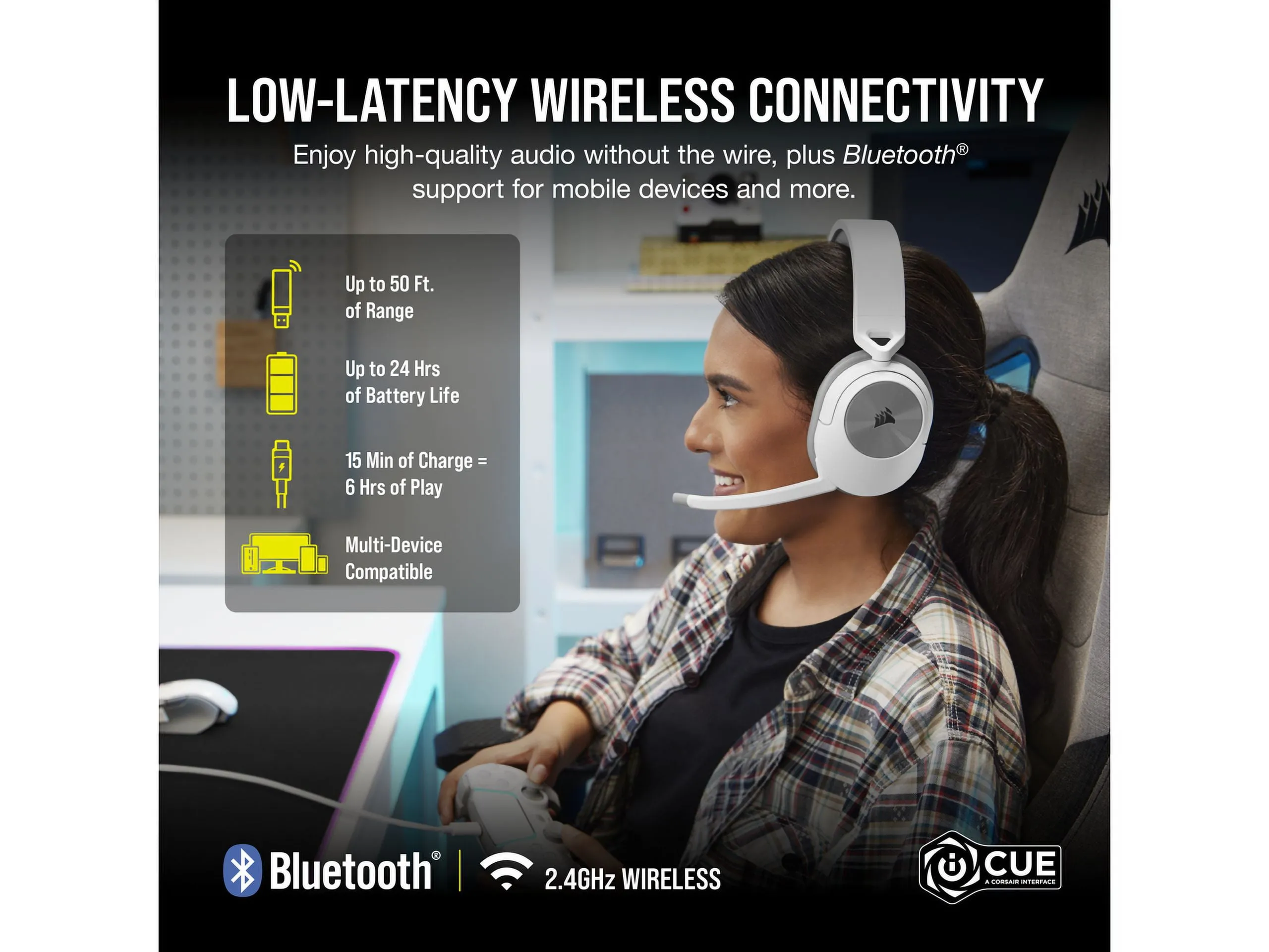 The CORSAIR HS55 WIRELESS Gaming Headset matches low-latency 2.4GHz wireless audio, Bluetooth, and Dolby Audio 7.1 surround sound on PC and Mac with lightweight construction for essential all-day comfort.