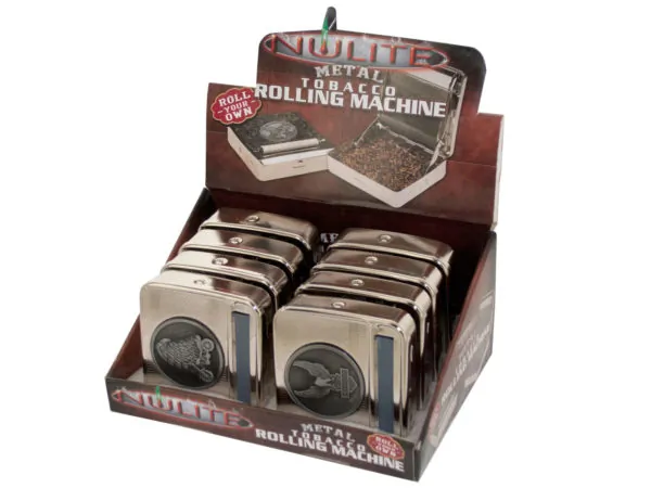 Introducing our Countertop Cigarette Rolling Machine Display Set, designed for effortless cigarette rolling and storage of your tobacco. This durable metal rolling machine features a sleek, hinged design and a decorative three-dimensional emblem. The included special blind ensures a smooth finish for each roll.