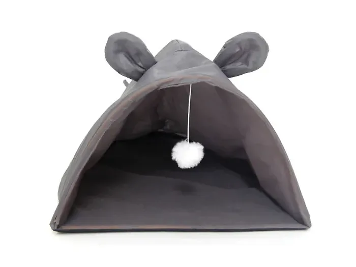 Give your feline friend a perfect nook to relax and play with our Cozy Mouse-Shaped Cat House. Crafted from durable nylon, this delightful cat house is designed to resemble a mouse, complete with cute ears and a crinkle tail for added fun. Inside, your cat will find a soft, plush lining for comfort and a fluffy white toy suspended from an elastic cord that makes for endless entertainment.