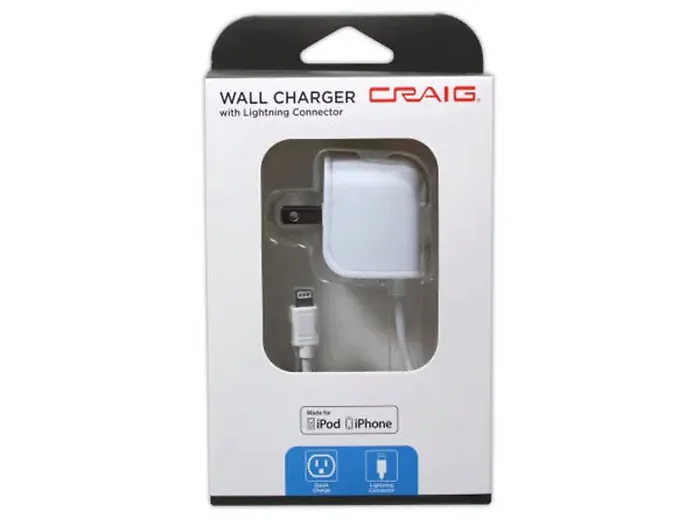The Craig 5.5 ft Lightning Wall Charger for iPhone is designed to provide a reliable and efficient charging solution for your device. With a generous length of 5.5 feet, it offers flexibility and convenience, allowing you to use your phone while it charges. Compatible with all iPhone models that use a Lightning connector.