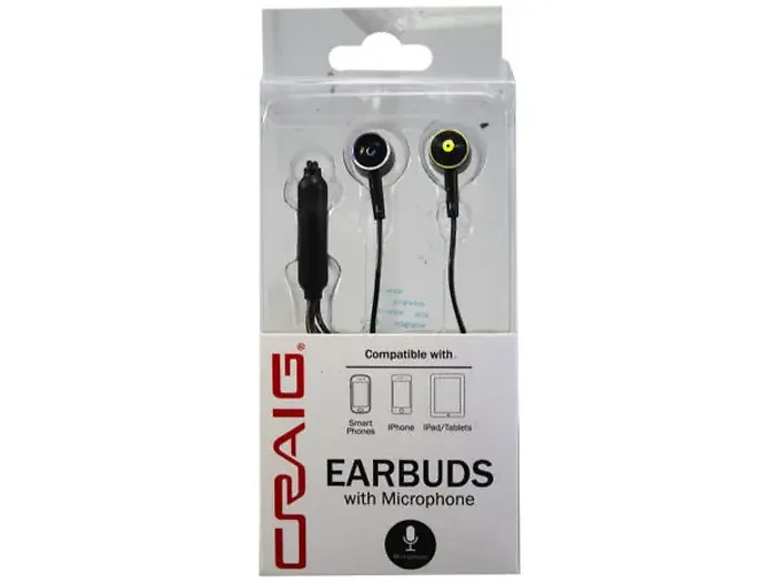 Experience your music like never before with the CRAIG Stereo In-Ear Earbuds. Designed for durability and comfort, these sleek black earbuds feature soft rubber tips that fit snugly in your ears. Whether you're exercising, doing chores, or relaxing, the approximately 3-foot cord allows for flexible movement.