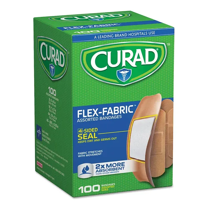 Curad Flex-Fabric Bandages are made of woven fabric that is designed to stretch, bend and breathe. Bandages stay on comfortably, even when wet. The water-repellent coating keeps the bandages dry and secure. The ouchless island pad comfortably protects the wound from germs and dirt with a four-sided seal. Skin-friendly adhesive leaves no sticky residue on the skin. Self-adhesive bandages come in assorted sizes for durable protection on all kinds of wounds. Each bandage is sterile and latex-free.