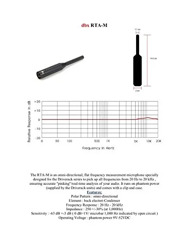 The DBX RTA-M DriveRack RTA Microphone is designed for accurate room analysis and setup. This lightweight microphone comes with a convenient clip, making it easy to position during measurements.