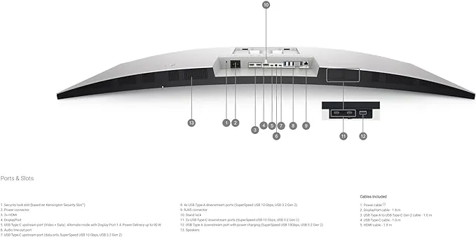 Experience no gaps in productivity One screen or two:Obtain seamless, multi-screen productivity with two 27" QHD partition capabilities complemented with exceptional color and contrast. Vibrant hues, sharp contrast IPS Black panel technology: Enjoy deeper blacks with the world's first 49-inch WQHD+ monitor with IPS Black panel technology that delivers exceptional contrast (2000:1) across a wide viewing angle. Equipped with 100% sRGB, 100% REC.709, 98% DCI-P3 and 98% Display P3 color coverage.Curved screen: Work comfortably with a curved screen that improves field of view andreduces reflection and eye fatigue.Enhanced eye comfort: ComfortView Plus is an always-on, built-in, low blue light screen that reduces potentially harmful blue light emissions without compromising color. Power your productivity Streamline your workflow: A single cable USB-C transmits data and video signals while delivering up to 90W of power.Fast and stable connection: Get up to 2.5GbE provided by RJ45 with PXE boot, Mac Address pass-thru and Wake on LAN features. RJ45 lock feature gives you the flexibility to lock the wired Ethernet to a chosen PC while continuing to work from dual PC inputs.Connect: A wide variety of devices are connectable with USB-A and USB-C Gen2 downstream quick-access ports that deliver speeds up to 10Gbps and DP1.4, HDMI and USB-C upstream ports. Starting is easy Quick connect: Conveniently located USB-C (up to 15W power) and USB-A ports make it easy to plug in external devices, and built-in dual 9W speakers saves you the hassle altogether.Dive right into your project: The built-in power sync feature wakes up and powers on your laptop. Power of two Internal Multi-Stream Transport (iMST): View your display across the full screen or split it into 2 x 27-inch QHD partitions with iMST. No external software or DisplayPort splitter needed.Multitask better: Connect to two PC sources and Auto KVM (keyboard, video, mouse) will seamlessly switch controls over to the second connected PC. Use KVM feature to control both PCs with a single keyboard and mouse. The KVM wizard makes setup a breeze. Set for comfort Work comfortably all day long by tilting, swiveling and adjusting your monitor height to however best fits you.