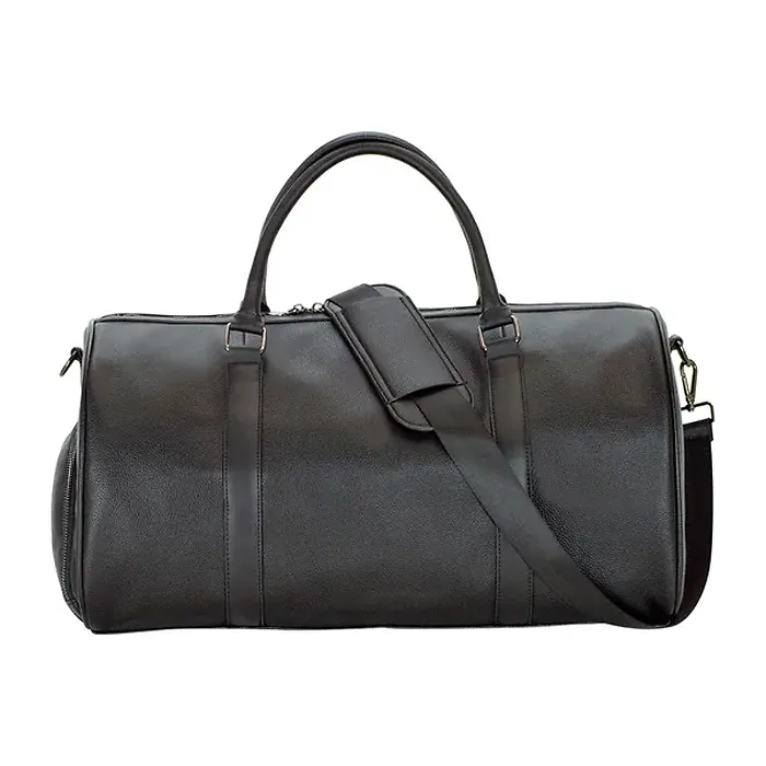 • Ideal bag for gym, overnight trip, or weekend getaway;• Designed to comply with airline carry-on size requirements and fit airline overhead compartments;• Stylish, pebbled vegan-leather exterior with durable, fully lined interior;• Roomy main compartment includes 2 zipper pockets and 2 open slip pockets for your personal items;• Handy, zippered shoe compartment keeps moist or dirty items separate from your other gear;• Easy-to-carry wrapped handles with 7-in. drop and removable, adjustable shoulder strap provide 2 ways to transport duffel; heavy-duty steel feet protect and stabilize duffel when placed flat;• Dimensions: 18.5 in. L x 12 in. W x 10 in. H;• Black;