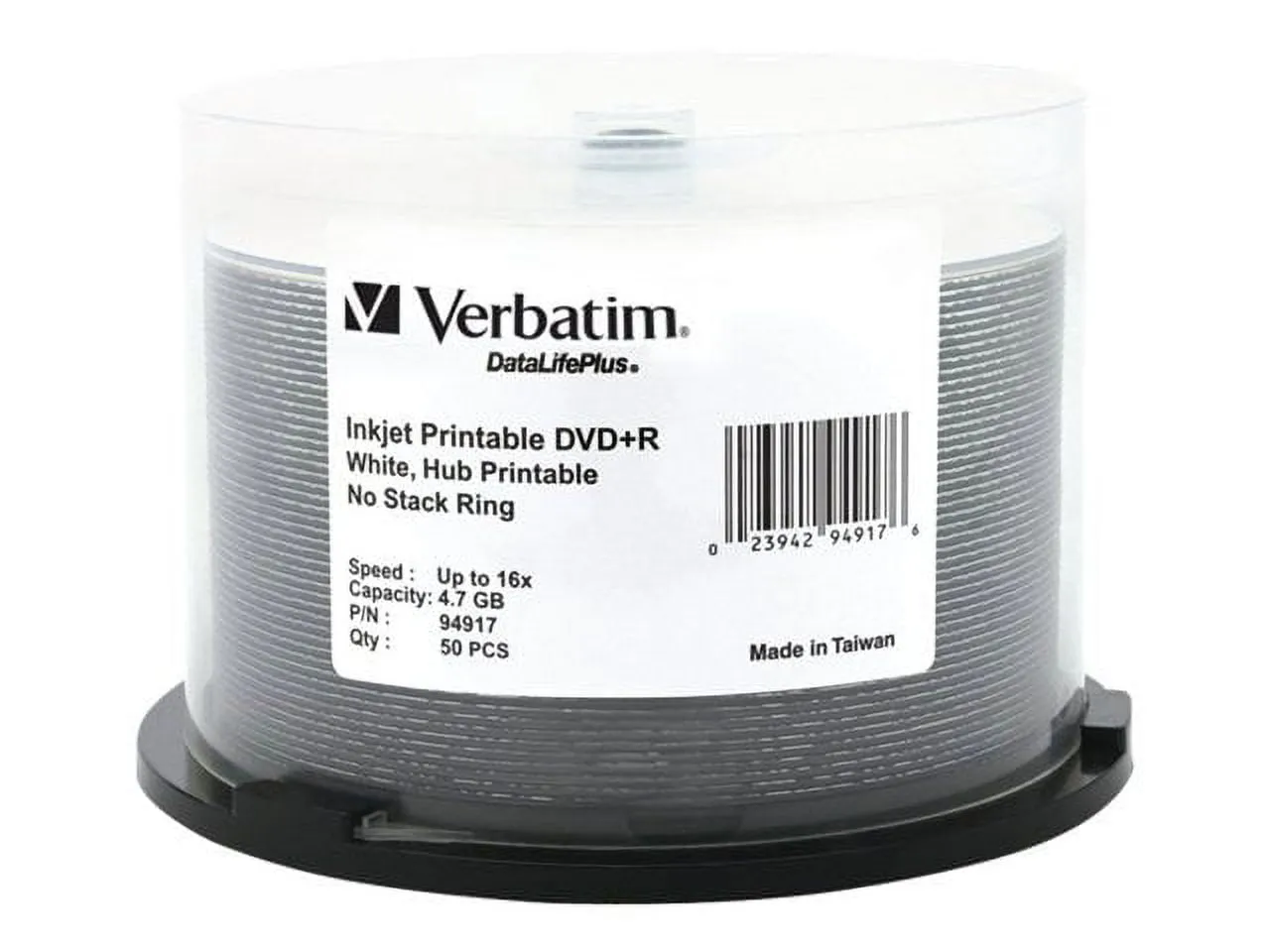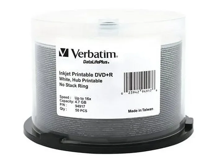 Verbatim 94917 Disc Dvd+r 4.7gb 16x Wht Ij Hub Printabledatalifeplus 50pk