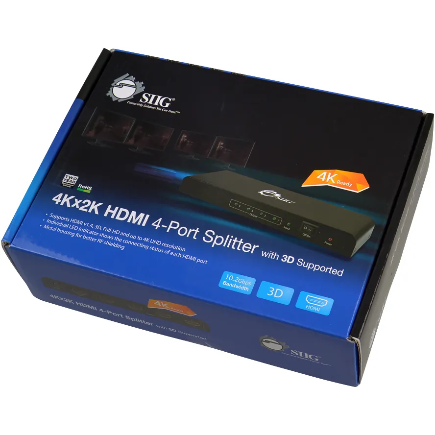 SIIGs 4Kx2K HDMI 4-Port Splitter with 3D Supported is designed to broadcast HDMI content from one HDMI source to 4 display units without signal distortion and degradation. It supports premium video quality with full scale display resolutions up to 4Kx2K, 3D video, HDMI Deep Color, and multiple digital audio formats including Dolby Digital, DTS-HD and Dolby TrueHD. It is easy and hassle-free to install with no software installation required. And it features automatic EDID learning ability to fully maximize the display units compatibility. This HDMI 4-Port Splitter is a great device for digital signage deployment to broadcast high definition audio and video for both home and commercial applications.Chipset: Silicon Image 19187B