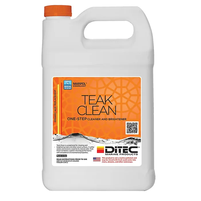 Teak Clean is a safe and effective, non-toxic, organic, and eco-friendly alternative to using phosphoric acid or other caustic cleaners. It’s specially engineered for teak and other wood surfaces and safely cleans and maintains the natural color of teak decks and wood furniture. Teak Clean combines ultra-low pH and superior cleaning performance with exceptional environmental properties. This product may be safely discharged into rivers, streams, oceans, and other waterways when used as directed.