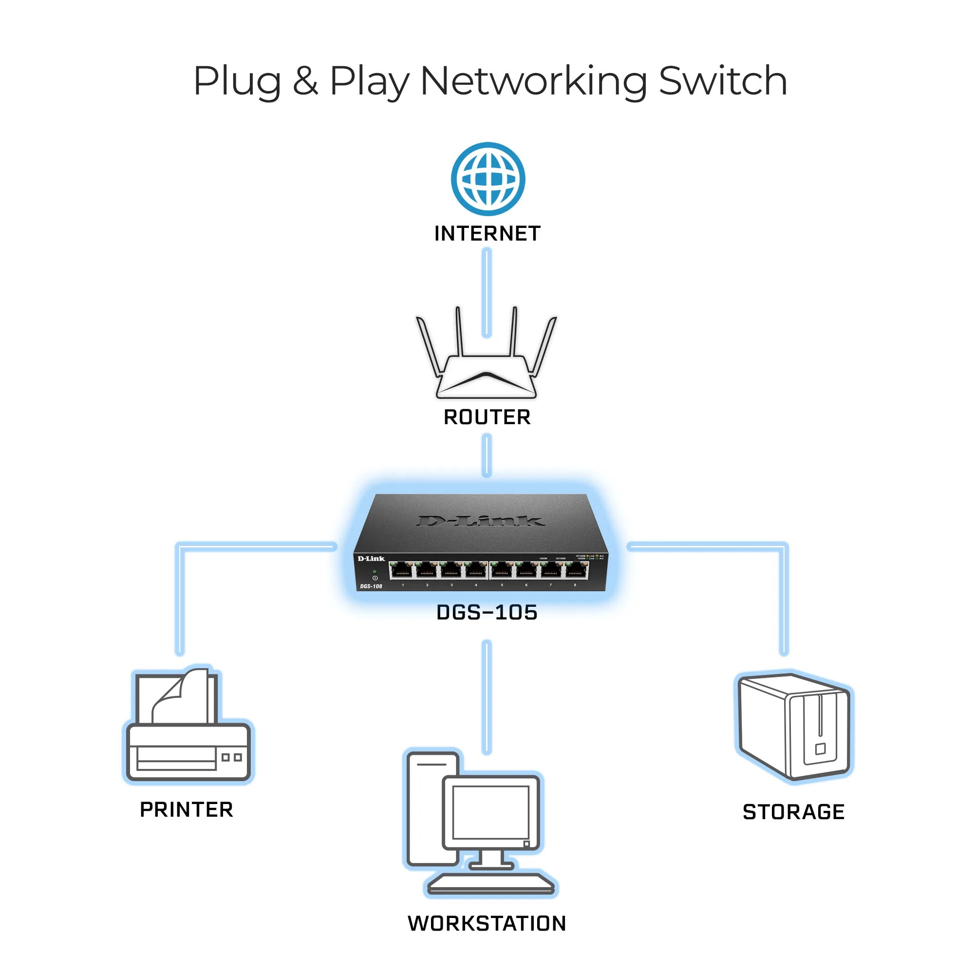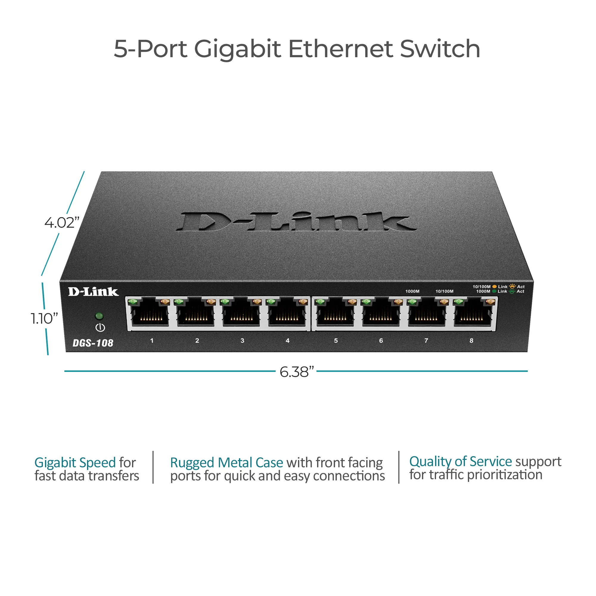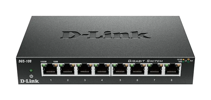 The DGS-108 8 Port Gigabit Switch provides a quick, easy and economical way to add high speed networking to home offices, small and medium businesses. With data transfer speeds of up to 2000 Mbps the DGS-108 is ideal for fast file transfers and easy expansion of your network for connecting printers, scanners, storage, and backup devices to any network. Compact design with metal case that is ideal for wiring closets, conference rooms or small offices. Use it on a flat surface or use the included wall mount kit.
