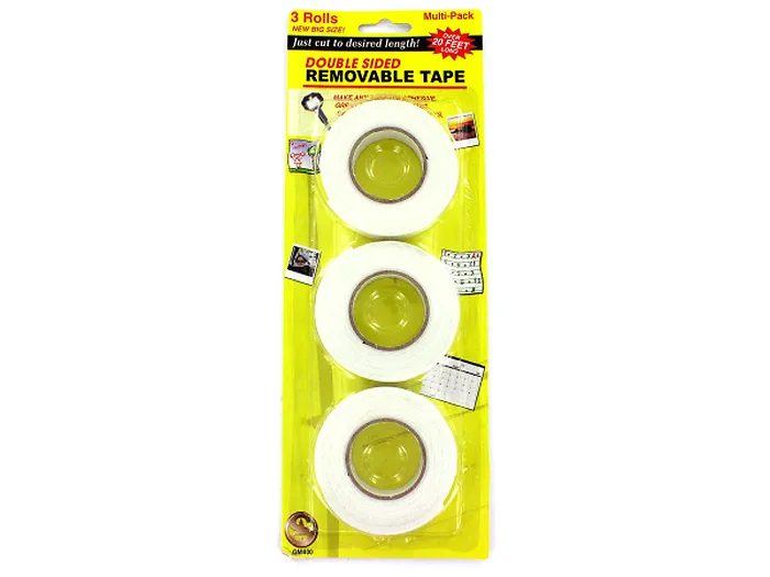 Make any surface adhesive with these 3 rolls of Double-Sided Removable Tape with protective liner. Just cut to desired length. Use 4 inches for each 1/2 pound of weight to be mounted. Use only for mounting objects up to 2 pounds. Apply on any surface, but not recommended on wallpaper, walls painted with flat paint, or on delicate surfaces. Instructions are provided on the back. The tape width is 5/8" and there is a total of approximately 20' in the package. Comes packaged in a blister pack.