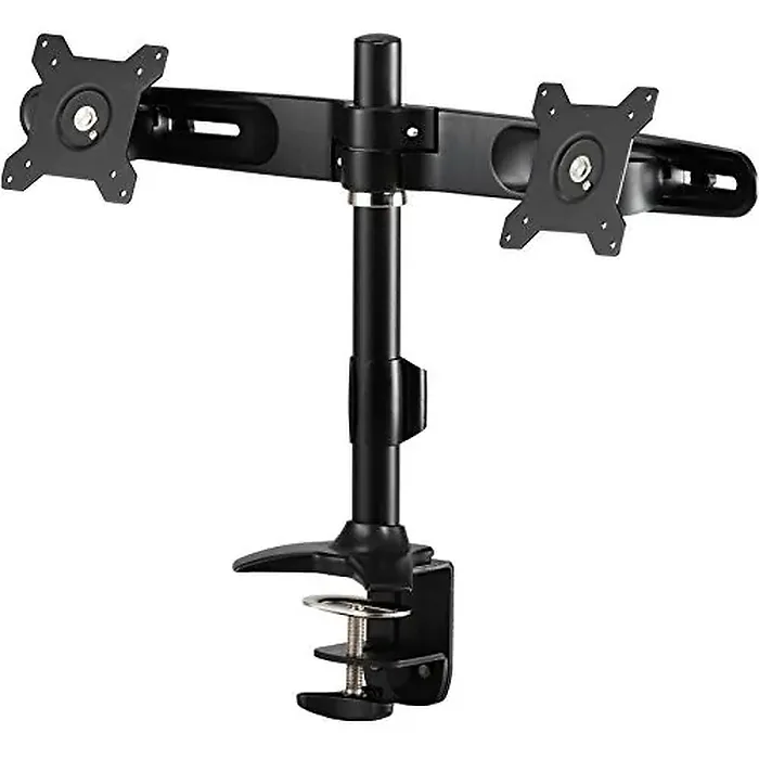 General InformationThis incredibly versatile product supports up to two 24" monitors each with a maximum individual weight of 26.5 lbs. Not only will this strong and sturdy mount have no trouble holding VESA certified 75x75 or 100x100 monitors, (fitting the above criteria), it is also extremely adjustable!Each monitor can be placed at a different height to accommodate different sized monitorsBoth monitors have 360 rotation (meaning landscape, portrait, or anything in-between)Also included is a +/- 20 tilt in any directionIndividual adjustments for BOTH Monitors, ensuring maximum user comfortHeight adjustable, with a maximum height of 13" from the desk to the center of the mounting deviceStudies show that dual monitors can increase productivity by up to 50%Benefits of Clamp Mounting: Clamp Bases are an excellent mounting option! They are screwed onto the edge of a desk for maximum space. (Clamp bases require a lip on the desk 8-50 mm thick and 85 mm deep)They are the sturdiest mount of the three kinds (stand, clamp and grommet)They take up the least amount of desk space (So much more room for activities!)Product InformationDevice Supported: Flat Panel DisplayMaximum Load Capacity: 53 lbMinimum Screen Size Supported: 15"Maximum Screen Size Supported: 24"Maximum Adjustable Height: 13"Features: TiltFeatures: PivotFeatures: RotateFeatures: SwivelFeatures: Cable ManagementFeatures: Smart Torque AdjustmentPhysical CharacteristicsColor: BlackVESA Mount Compatible: YesVESA Mount Standard: 75 x 75VESA Mount Standard: 100 x 100Material: SteelMaterial: Aluminum AlloyHeight: 18.5"Width: 26.5"Depth: 5.7"Weight (Approximate): 7.36 lbMiscellaneousAdditional Information: Easy InstallAdjust +/- 20 degree tilt in any directionArms Rotate 360 Degrees About the Central PoleCompatibility: LCD MonitorCountry of Origin: TaiwanTAA Compliant: YesWarrantyLimited Warranty: 3 Year