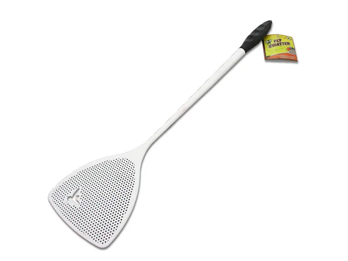 This expertly designed swatter is constructed from sturdy white plastic and features a comfortable black rubber grip handle. It showcases a playful cut-out fly design on the swatting area, making pest control a bit more fun.