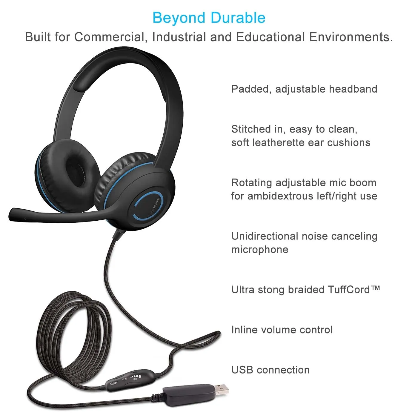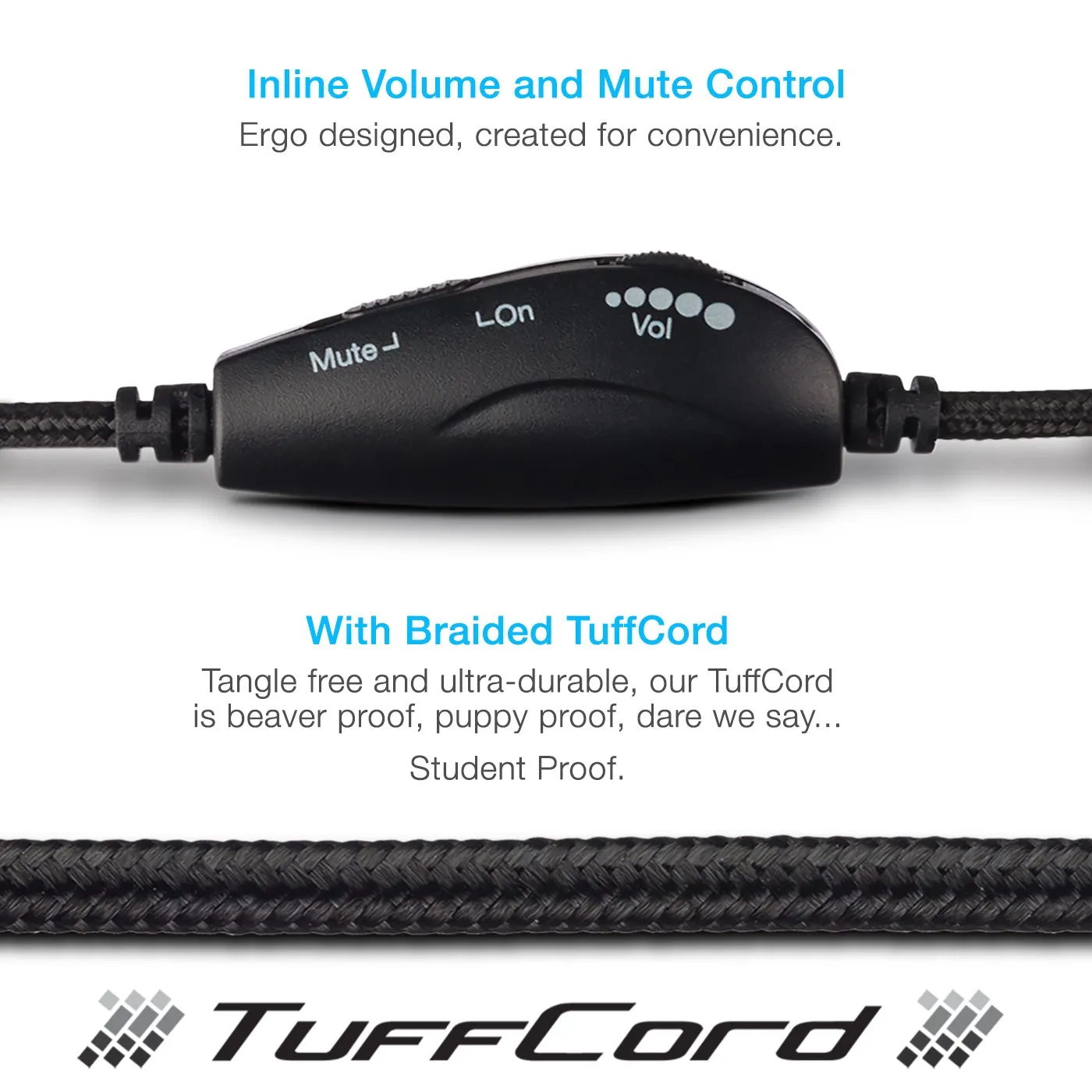 The Durable USB Stereo Headset is designed for comfort and clarity. It features in-line volume and mute controls, ensuring you have easy access to audio settings. The braided 'Tuffcord'™ cable enhances durability, while leather earpads provide maximum comfort during extended use.