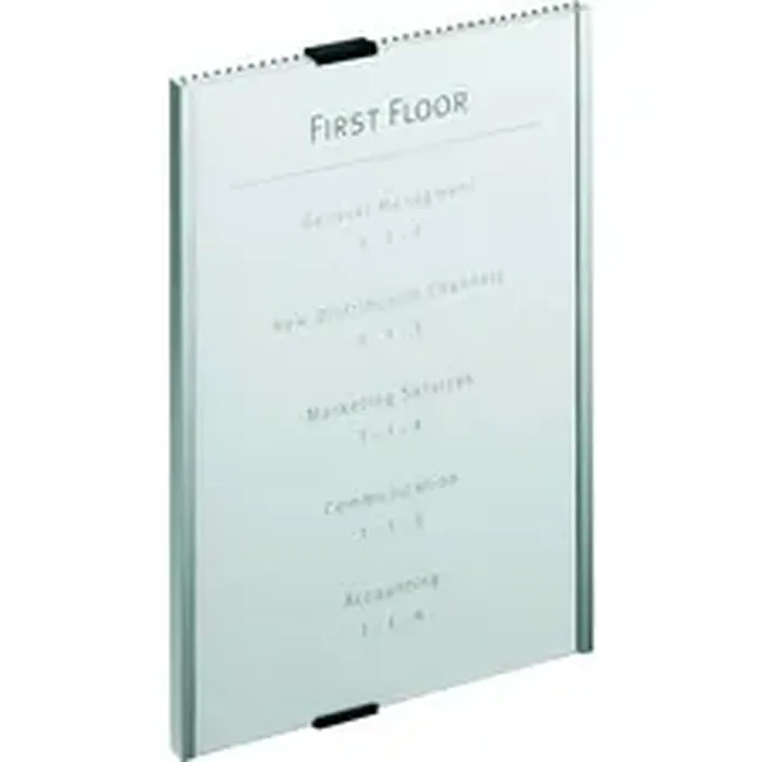 Information sign features a removable top clip for instant updates whenever changes occur. Clear acrylic panel completely showcases your insert for excellent visibility. Aluminum back plate is pre-drilled for easy wall mounting with the included screws and anchors. Plus, adhesive disks provide another way to mount the sign. The elegant back ribs form an attractive design that complements all decors. Use the free, online insert-formatting software to make professional style signs. Sign is compatible with Durable, printable replacement insert packs (sold separately).