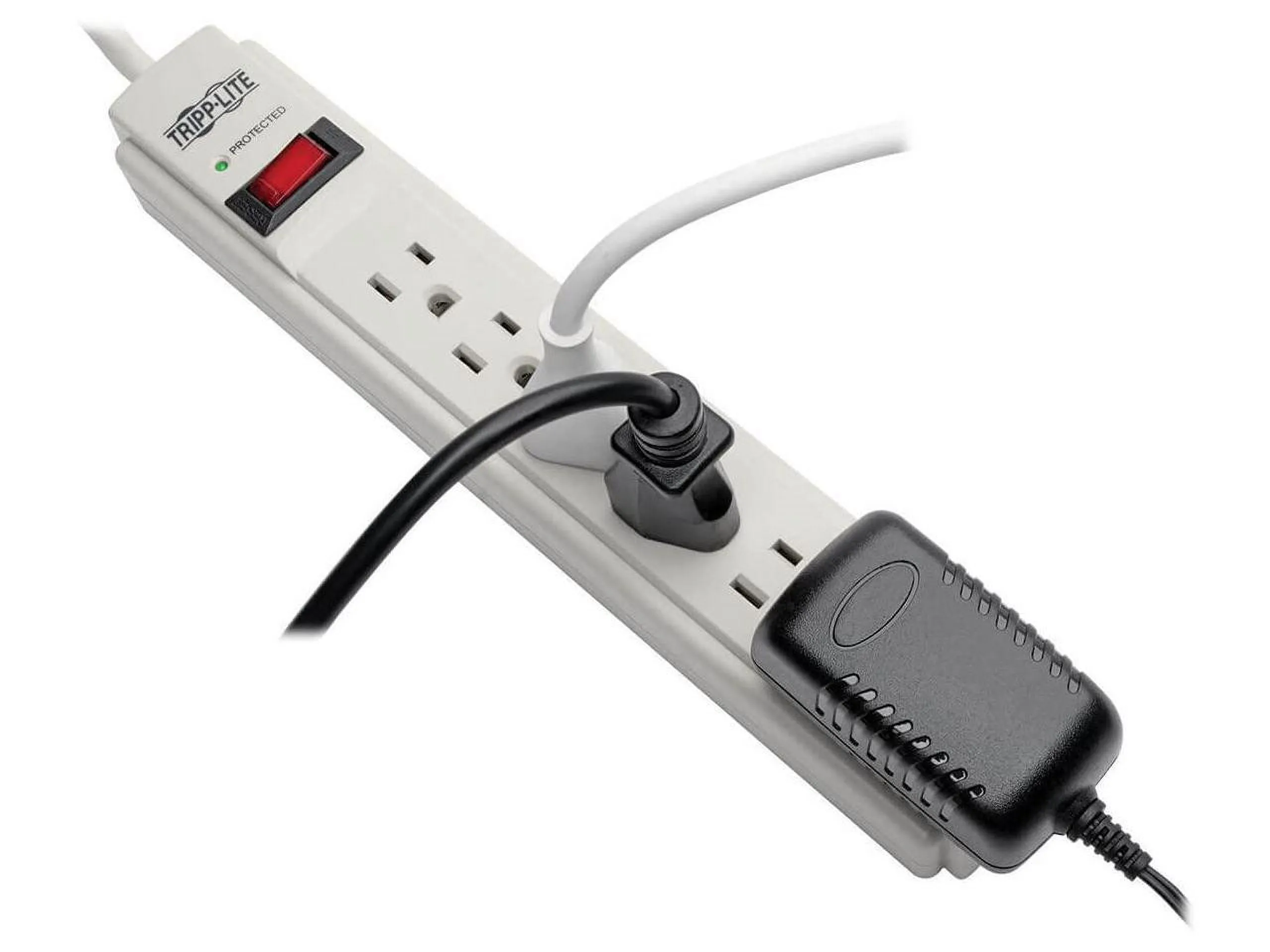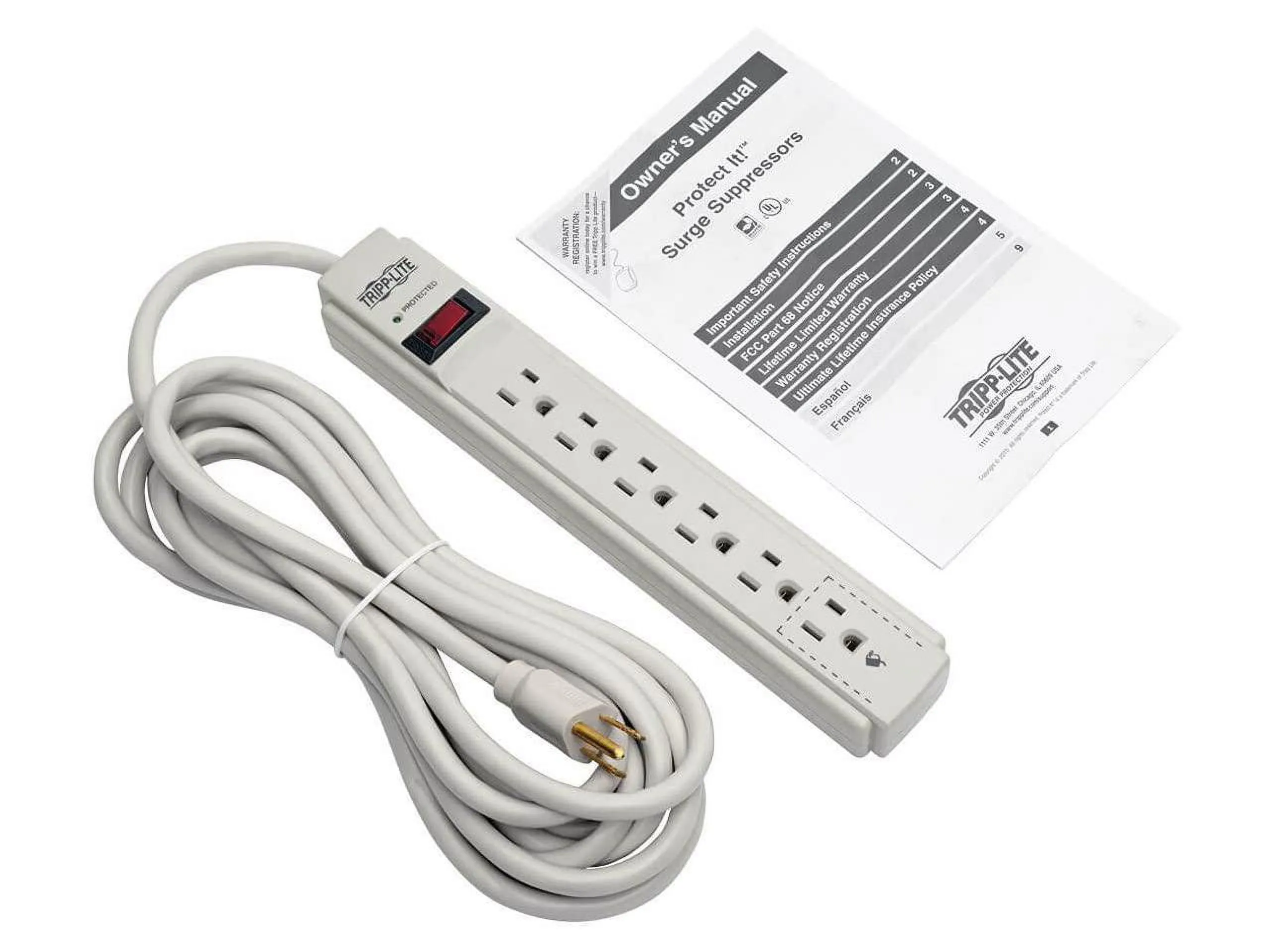 Tripp Lite's TLP615 offers economical AC surge suppression for protection of workstations, desktop PCs, telecom systems and other sensitive electronics. Built-in AC surge suppression shields connected equipment from damage and performance problems due to transient surges. TLP615 offers 6 total outlets, 15 foot cord and diagnostic LED to warn of suppressor damage. AC suppression rated at 790 joules shields equipment from surges and line noise. Attractive gray suppressor housing with keyhole mounting tabs offer convenient protection of desktop computer equipment and accessories. $20,000 Ultimate Lifetime Insurance (USA & Canada Only). Key Features 6 outlets 15-ft. cord Surge suppression rating: 790 joules EMI/RFI noise filtering 15 amp resettable circuit breaker Green protection LED Includes full normal mode (H-N) and common mode (N-G/H-G) line surge suppression Can accommodate 1 large transformer plug without covering remaining outlets, 3 total transformers Keyhole support for wall mounting Lighted power switch $20,000 Ultimate Lifetime Insurance (USA & Canada only) Lifetime product warranty Typical Applications Ideal for any desktop, network or home computing application requiring AC line protection Package Includes TLP615 surge suppressor Instruction manual with warranty information