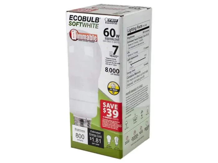 Replace your 60 Watt light bulb with this Feit Electric Ecobulb Softwhitre Dimmable 15 Watt Light Bulb. The bulb out up 800 lumens of brightness and has 8,000 hours of lifespan — ideal for table lamps, chandeliers, lanterns, and wall sconces. Comes packaged in a 6" x 2.50" x 2.75" box.