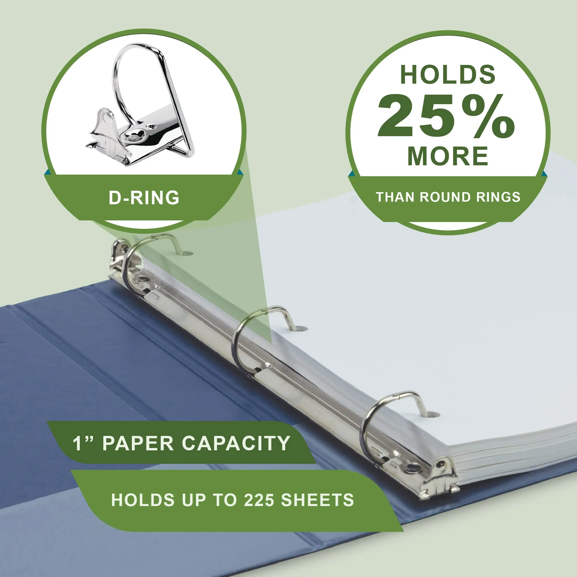 Each binder features durable chipboard constructed from 100% recycled material, offering a minimum of 98% post-consumer content. They can comfortably hold up to 225 sheets of standard three-hole-punched paper (sheet size: 8.5x11 inches), making them ideal for various projects and documents.