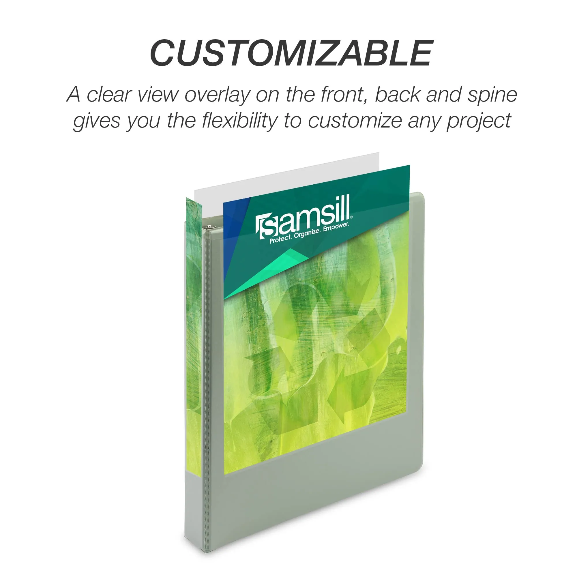- Clear overlay for customizable front, back, and spine