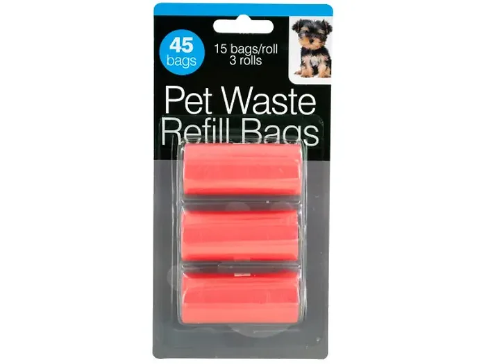 Keep your pet waste dispenser stocked with our Eco-Friendly Pet Waste Refill Bags Set. This convenient set includes 3 rolls of lightweight plastic bags, each containing 15 bags, for a total of 45 bags. Designed with the environment in mind, these biodegradable bags help you clean up after your pet while reducing plastic waste. Available in assorted colors to suit your style. Comes packaged in a blister pack for easy display and storage.