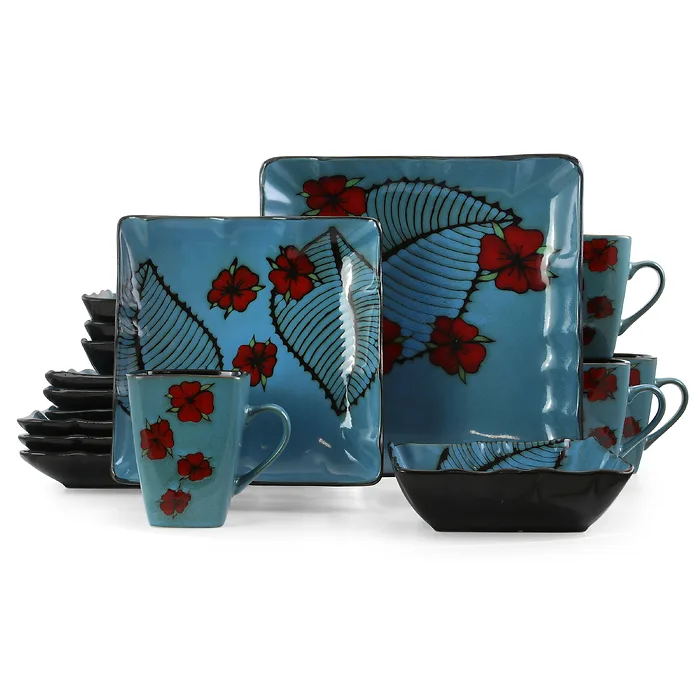 Enhance your dining experience with the Elama Aloha Tide 16-Piece Dinnerware Set, perfect for tropical-themed gatherings. This stunning set features a vibrant blue color adorned with red and black floral accents, bringing a lively ambiance to your table. Each dish is crafted from durable stoneware, designed to handle daily use while adding a contemporary flair to your meals.