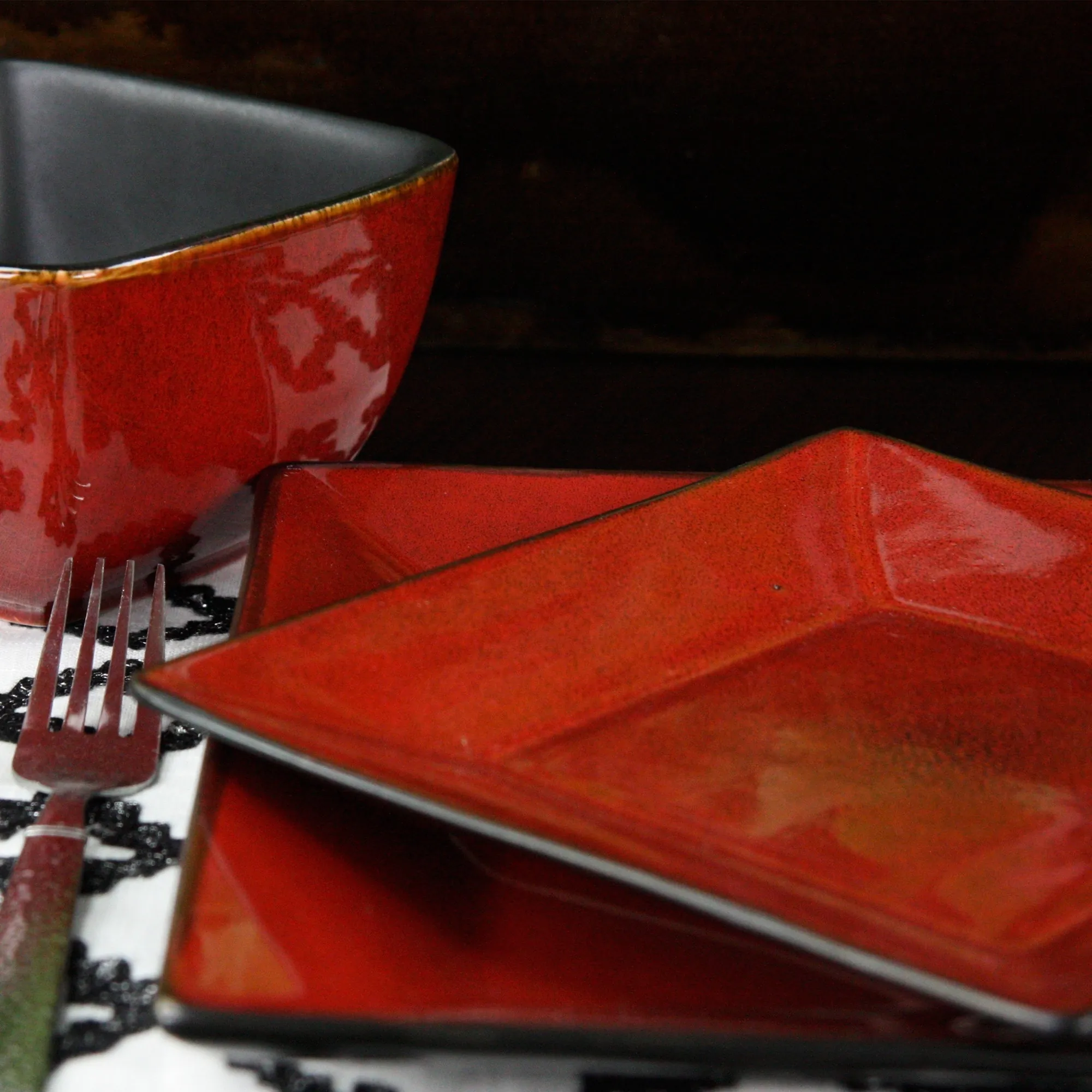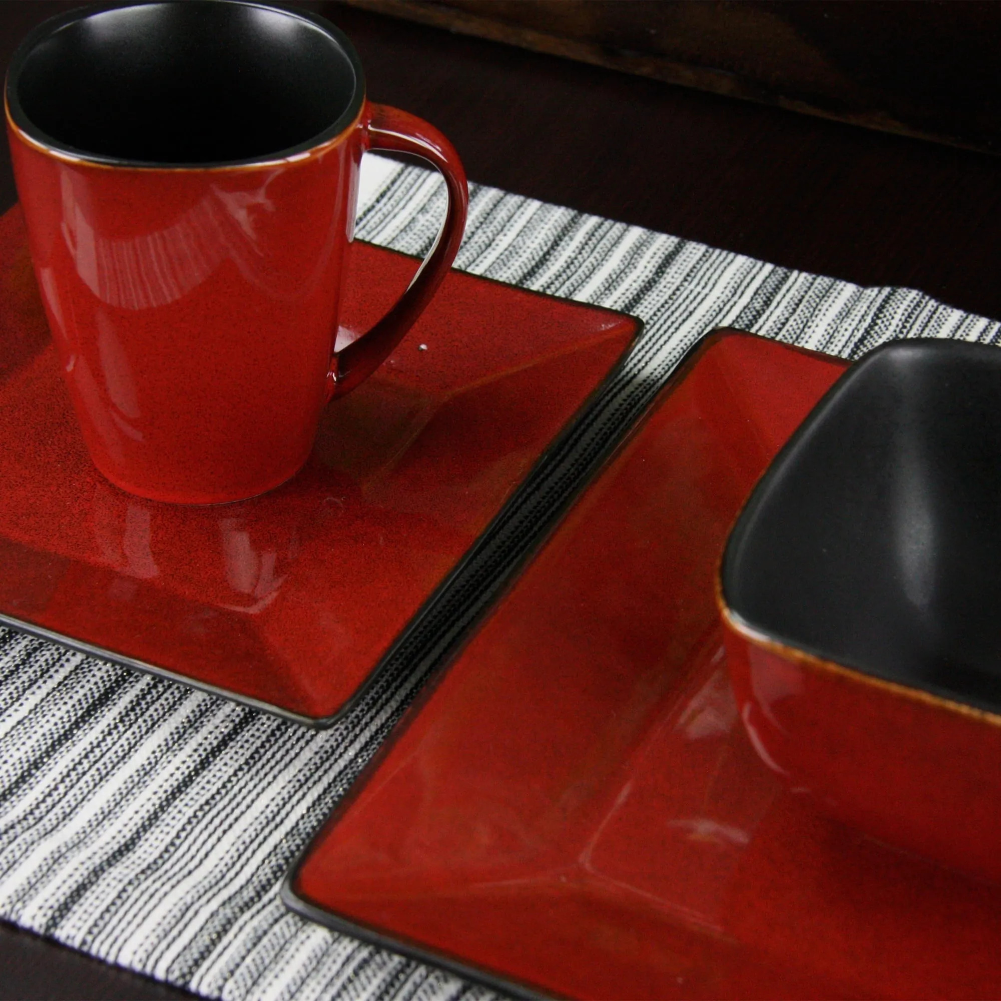Elama presents the Harland Loft 16 piece Modern Premium Stoneware set with complete table setting for 4. This dinnerware set is ready to make a statement at your next dinner party. With a sophisticated and bold color block design this set is pure style and individuality.Harland Lofts tones are chosen to highlight your meal and accentuate the naturally scrumptious hues of the foods this plate so elegantly displays. This high quality stoneware set feature large dinner plates measuring diagonally at 14.75. No matter the appetite of your guests this plate will be up to the challenge. The Desert Plate is not far behind with a an impressive diagonal measurement of 11.25 for any guest with an extra large sweet tooth!