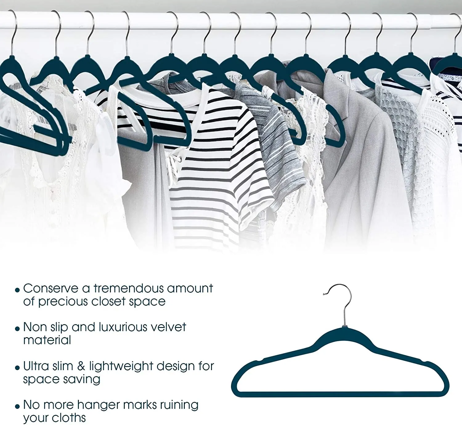 - MAXIMIZE YOUR CLOSET SPACE: The Elama Home 50 Piece Set of Velvet Slim Profile Heavy Duty Felt Hangers with Stainless Steel Swivel Hooks are a thin and lightweight storage method for your garments